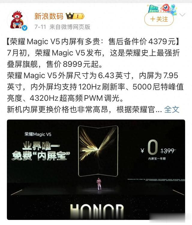 新浪数码官方微博发布消息称:7月初上市的荣耀Magic V5以全球最轻薄折叠旗舰(折叠态8.8mm/217g)和8999元起的售价引发市场热议。然而,其官网近日公布的备件维修价却让消费者咋舌:更换内屏需花费4379元,相当于一台全新荣耀Magic 7的价格。